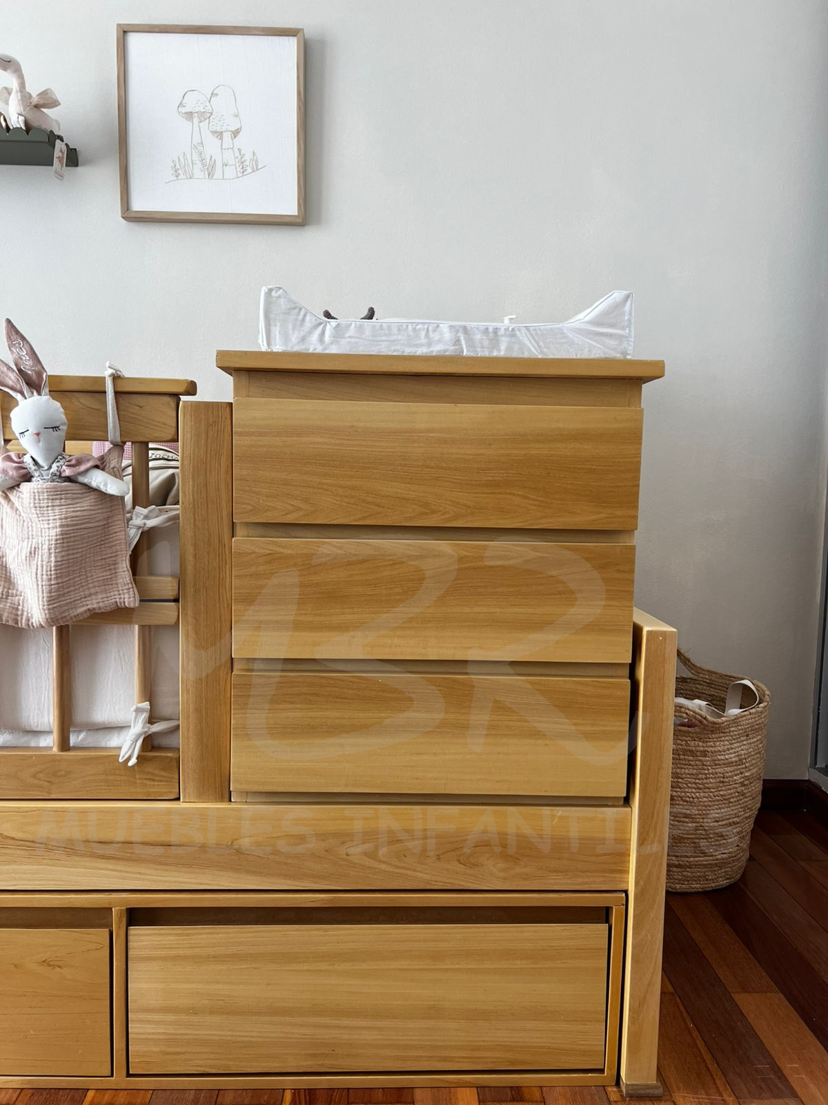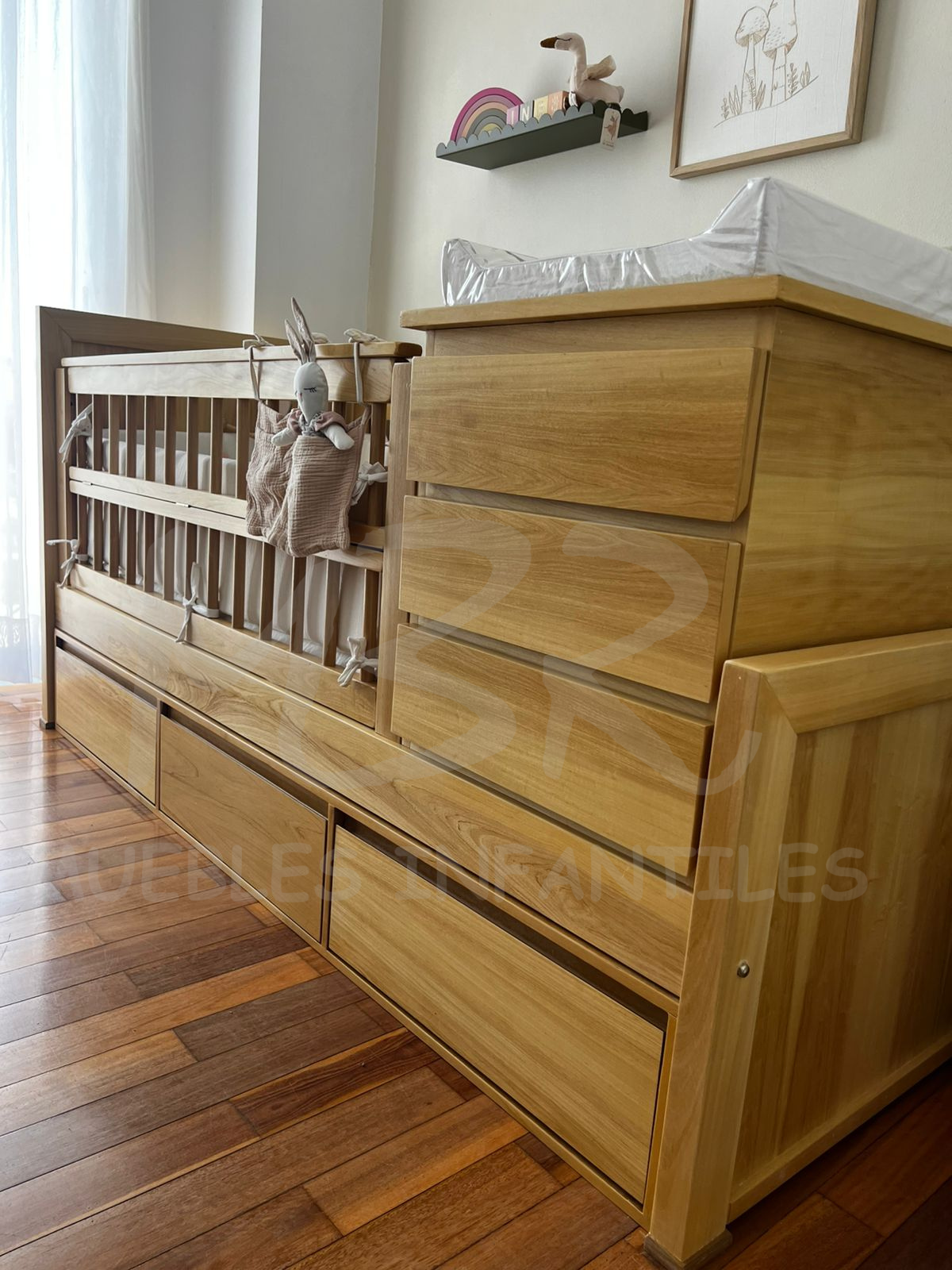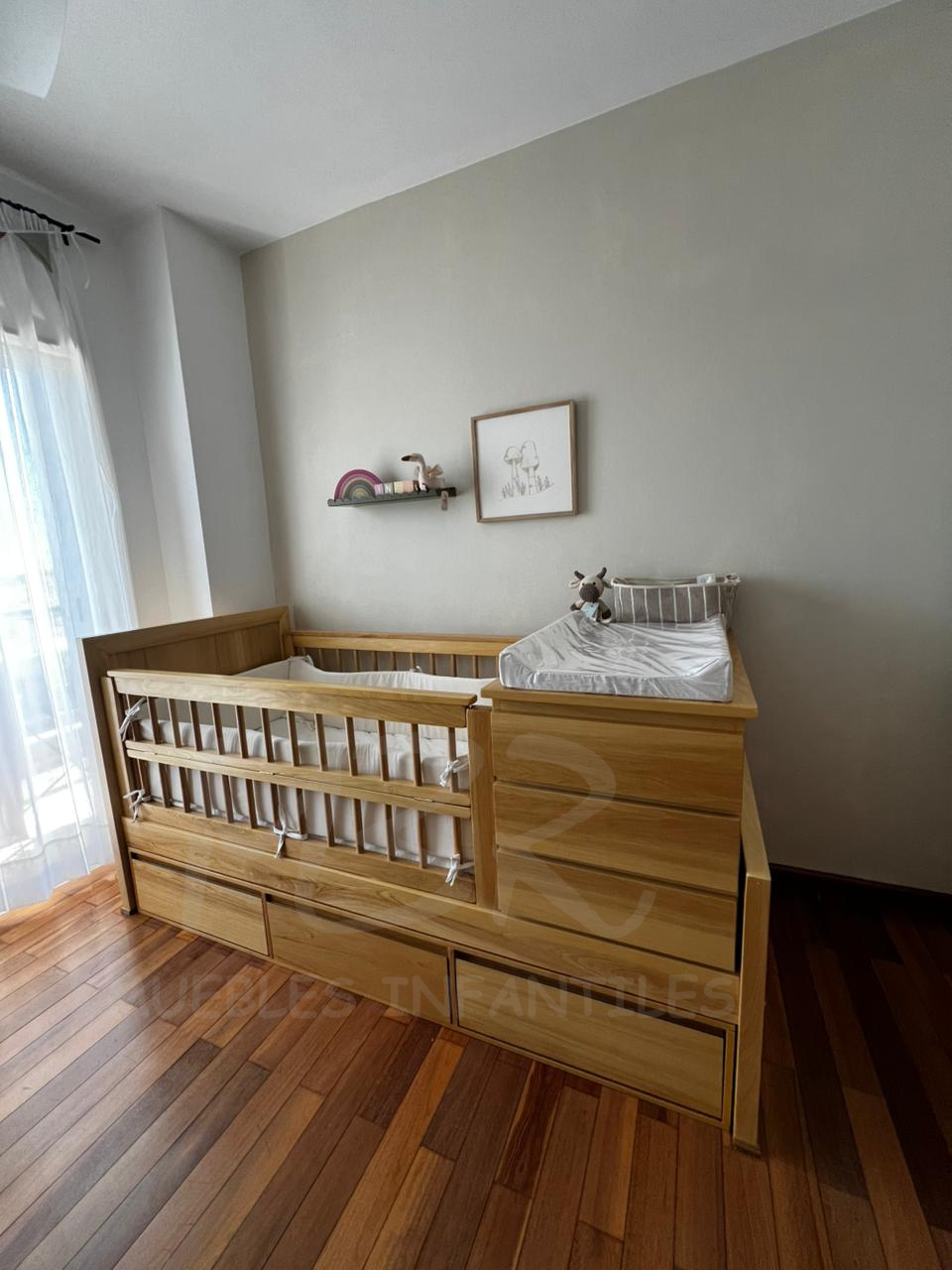 Utilizamos guías telescópicas de 24k en los cajoncitos, aptas para un uso cotidiano y soportar bastante peso🙏🏻. Además, cuenta con una baranda rebatible que se dobla a la mitad para no forzar tanto la espalda al acostar a tu bebé (si no te gusta la baranda rebatible podes pedirla enteriza)