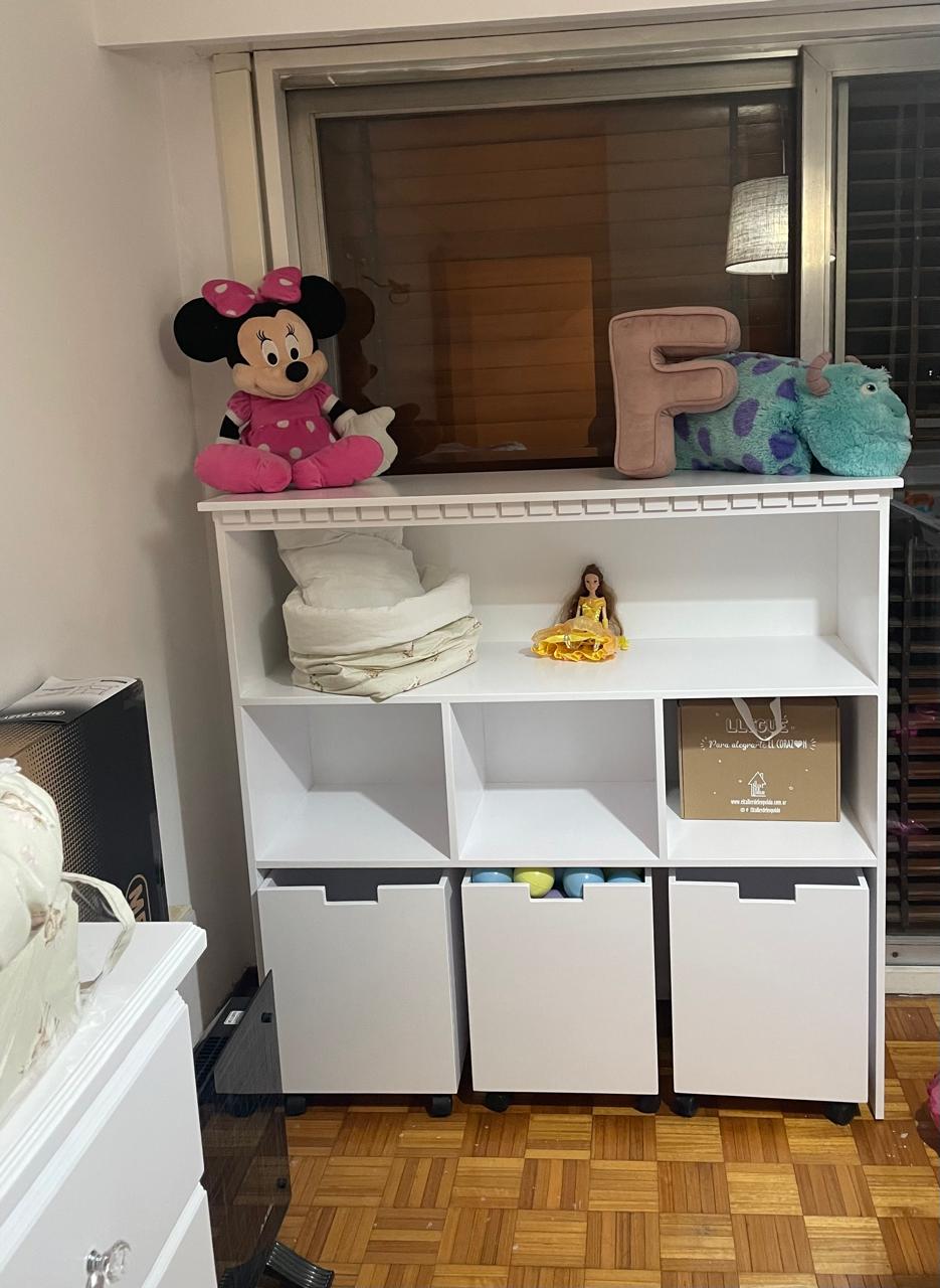 Posee 3 box guarda juguetes con ruedas y dos estantes, el del medio con divisiones.